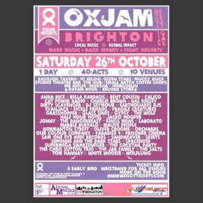 Oxjam Brighton Takeover have released tickets online at www.wegottickets.com which are now available at the early bird price of £5, with 100% profits going to Oxfam. This will get you a wristband for all venues all day & night. Price will increase close to and on the day. And if for any crazy reason you can’t make the festival, you can still do your bit and donate to Oxfam – Justgiving: Text OXBR to 70070 to donate £5